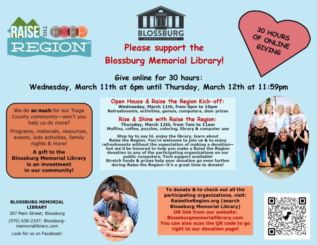 Raise the Region is a unique 30-hour fundraiser hosted by the First Community Foundation Partnership of PA. Donations can be made to our library (and to many other local non-profits).